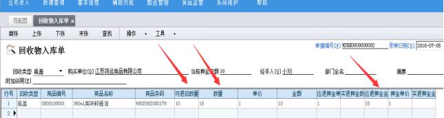 (當(dāng)客戶退回包裝物時(shí),將對(duì)應(yīng)的押金退回給客戶), 輔助功能-包裝物回收物管理-回收物入庫單,錄入對(duì)應(yīng)的數(shù)量,軟件計(jì)算出押金金額