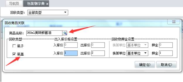 輔助功能-包裝物回收物管理-包裝物字典:關(guān)聯(lián)對(duì)應(yīng)的商品,如:360ml美味鮮醬油,設(shè)置入庫價(jià)和出庫價(jià),以及換算單位和押金